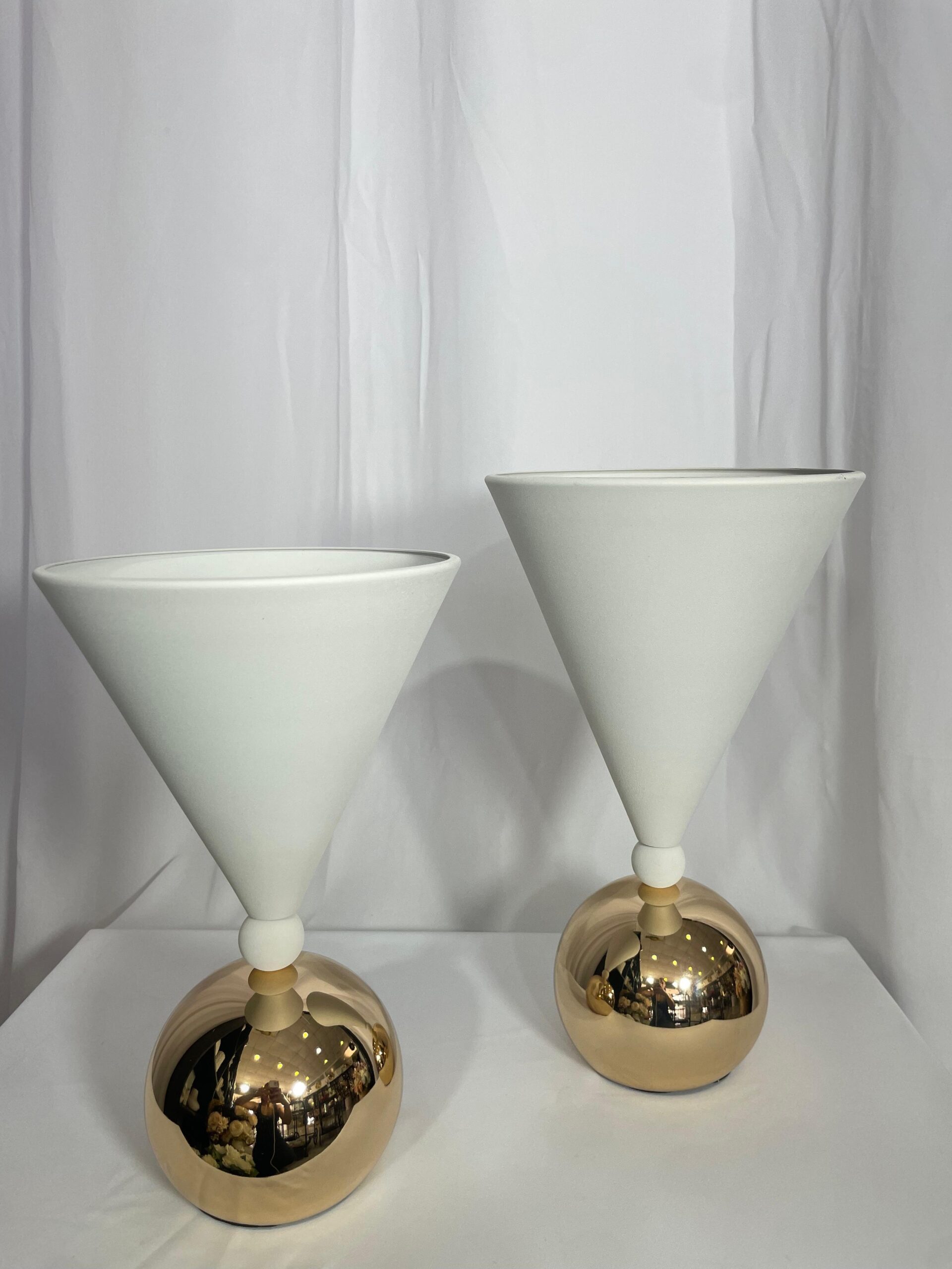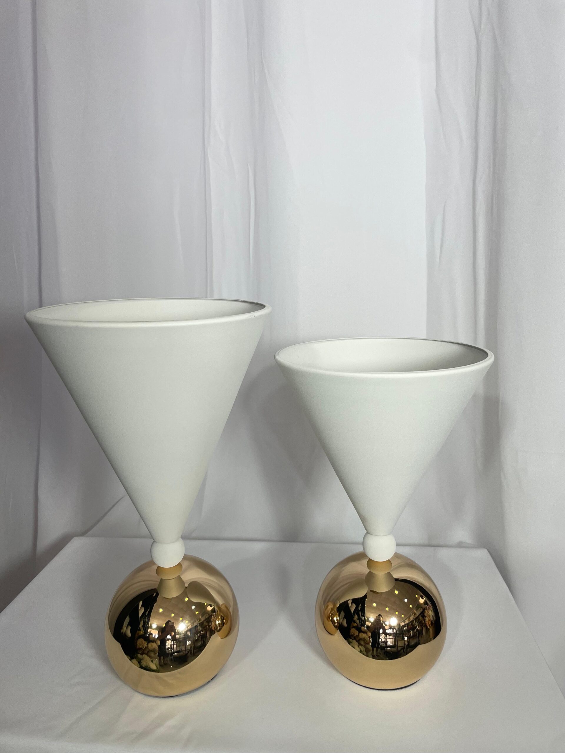 זוג אגרטלים הפוכים בצורת חרוט הפוך בצבע לבן מט, המונחים על בסיס כדורי מוזהב מבריק. שילוב של קווים גיאומטריים עם גימור אלגנטי מעניק למוצר מראה יוקרתי ומודרני, המתאים לעיצוב אירועים, סלון, פינת אוכל או משרד. ניתן לשימוש כאגרטל לפרחים יבשים או כפריט עיצוב עצמאי.