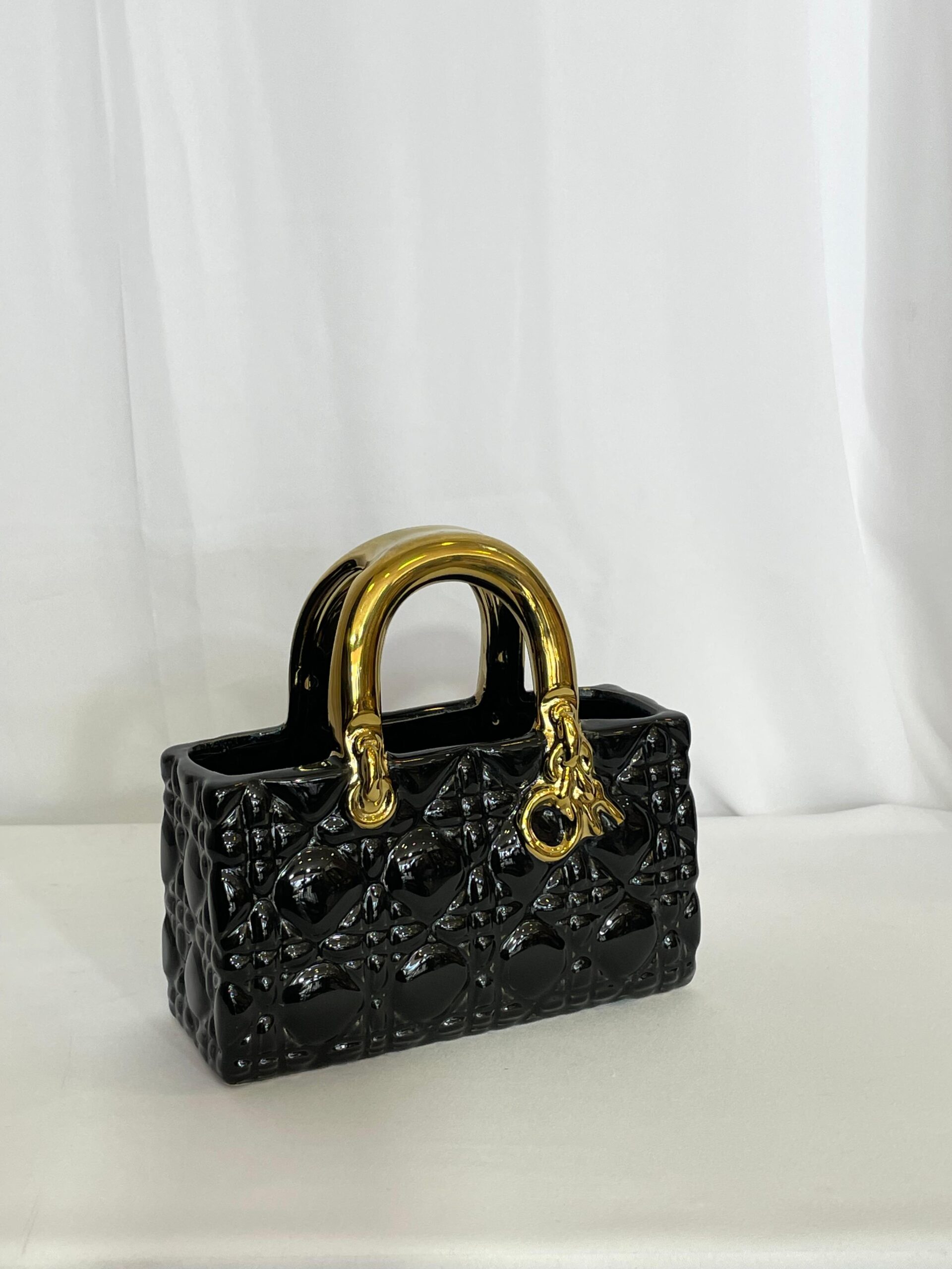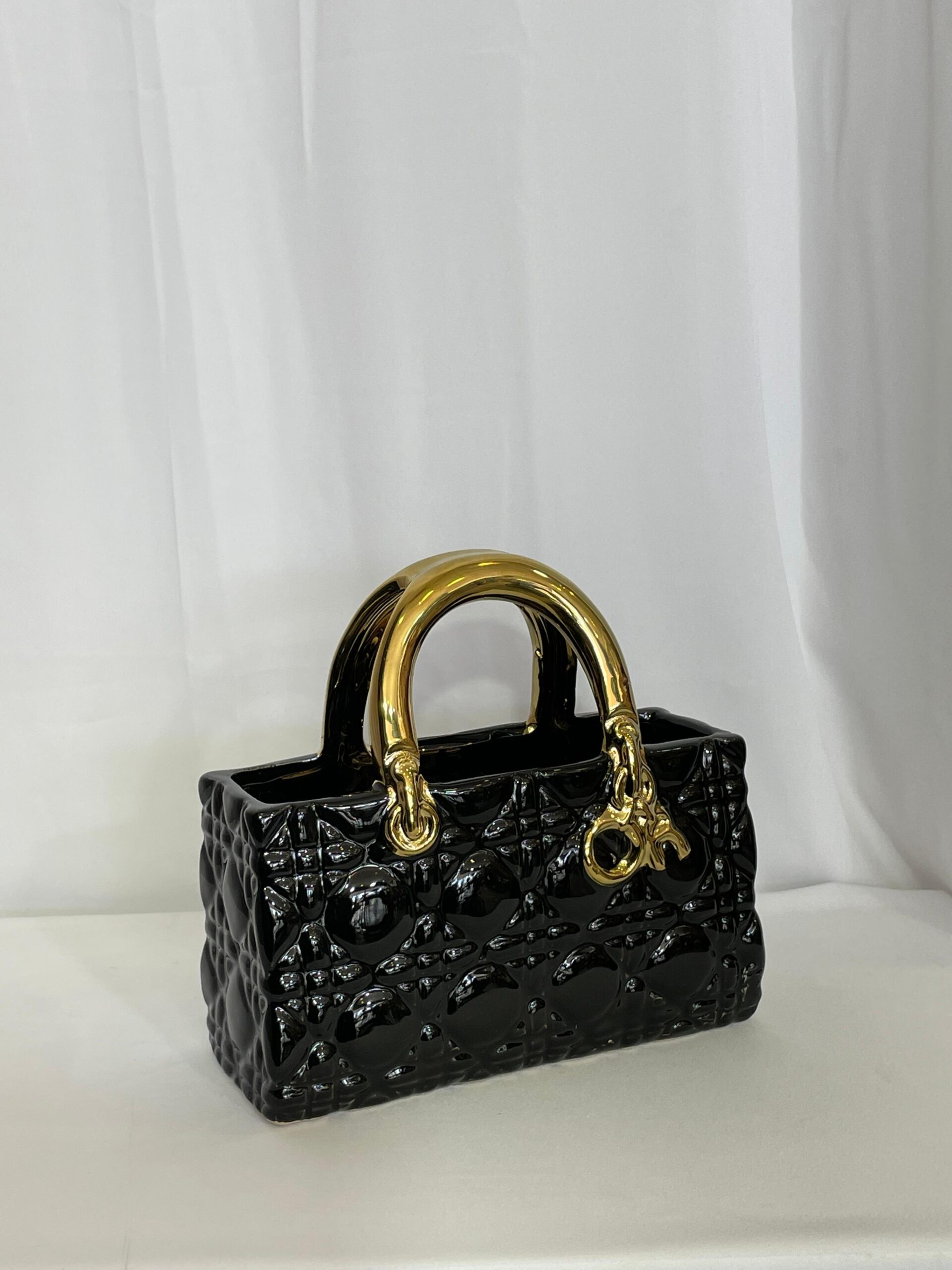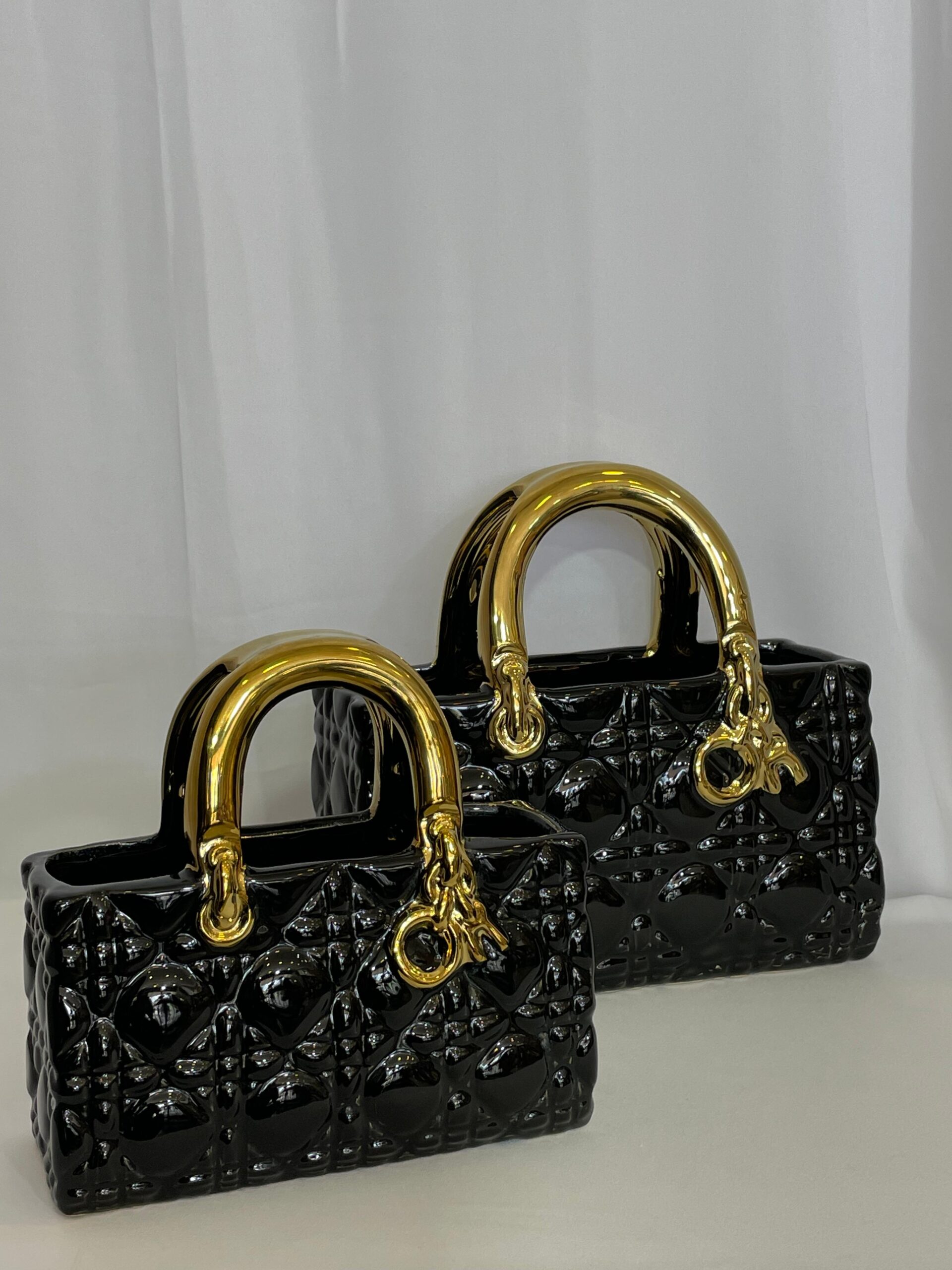אגרטלים קרמיים בצורת תיק יוקרתי, בצבע שחור מבריק עם ידיות ותליון דקורטיבי בציפוי זהב מבריק. העיצוב האלגנטי משלב טקסטורה גיאומטרית על גוף הקרמיקה עם גימור יוקרתי ומודרני. האגרטלים יכולים לשמש כפריט דקורטיבי מרשים בפני עצמו או כאגרטל לפרחים מלאכותיים או טבעיים, ומתאימים להוספת נגיעה של יוקרה וסטייל לכל חלל – סלון, חדר אוכל או כמתנה מעוצבת.