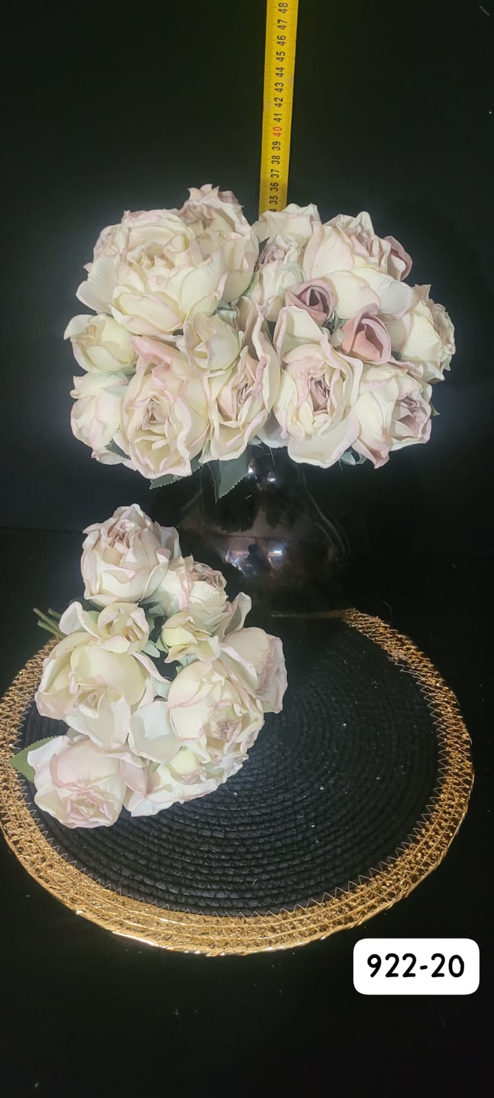 זר פרחים מלאכותיים דמוי ורדים פתוחים, בעיצוב עשיר ורב שכבות, בגוון שמנת עם נגיעות ורדרדות עדינות בקצות העלים. הוורדים משדרים אלגנטיות ורומנטיקה ומתאימים לשילוב בעיצוב אירועים, מרכזי שולחן, סידורי פרחים לבית או לאגרטלים דקורטיביים.