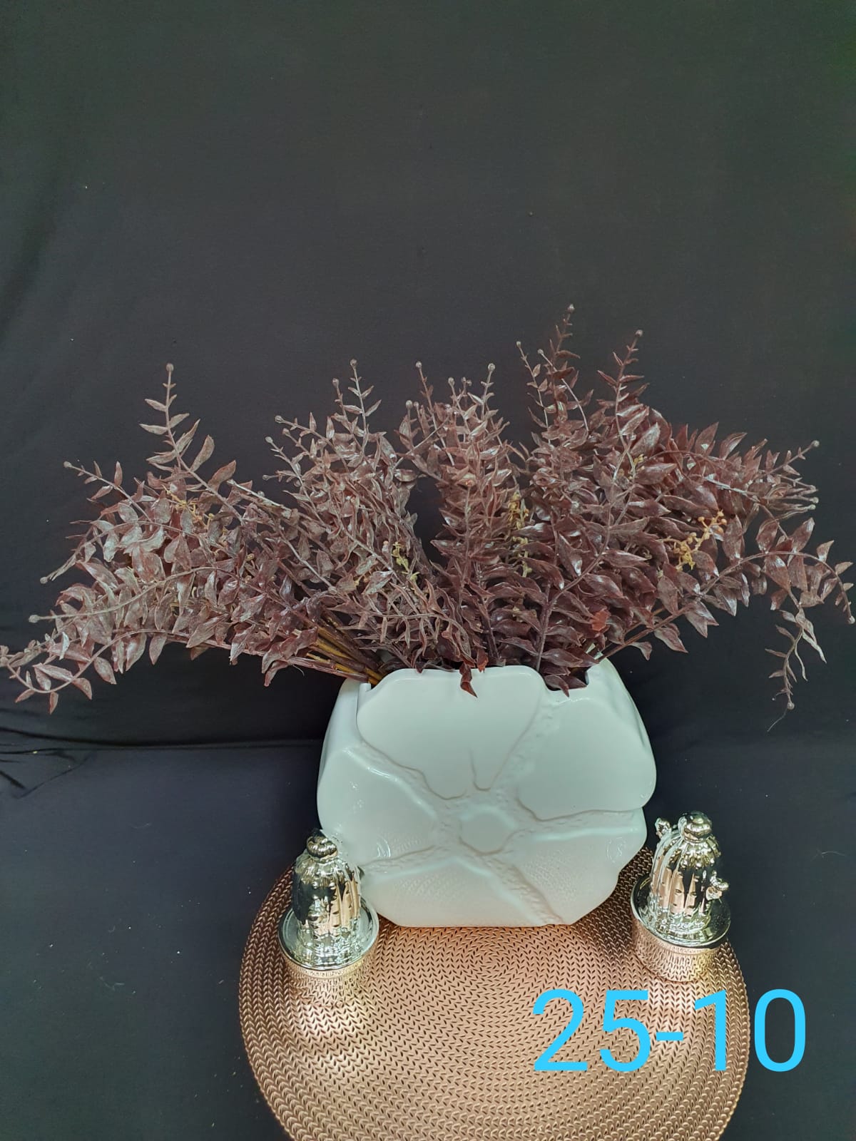 שרך מלאכותי בגוון בורדו כהה – העלים הקטנים והצפופים, הצבע הסגלגל-חום והפריסה המעוגלת מדמים צמח מהמשפחה של השרכים או האספלניה. זהו צמח קישוט פופולרי בזרים יבשים, ומעניק תחושת טבע עשיר.