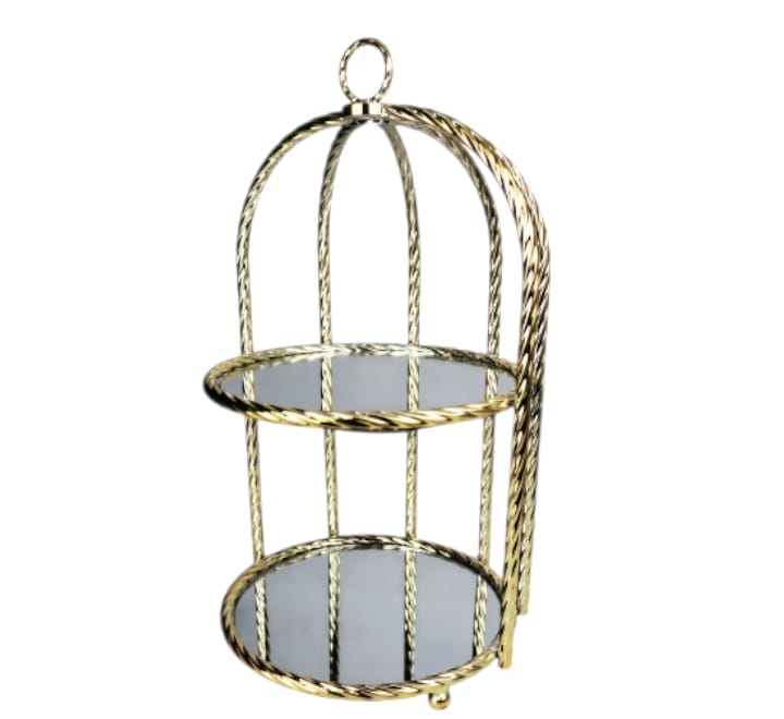 מתקן תצוגה מעוצב בציפוי זהב מבריק, כולל שתי קומות עם בסיסי מראה. מתאים לעיצוב אירועים, שולחנות קטנים, עמדות קינוחים ותצוגות דקורטיביות. מעניק מראה אלגנטי וקליל לחללים קטנים ובינוניים.
