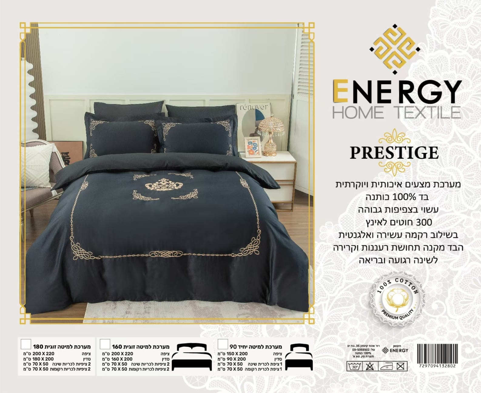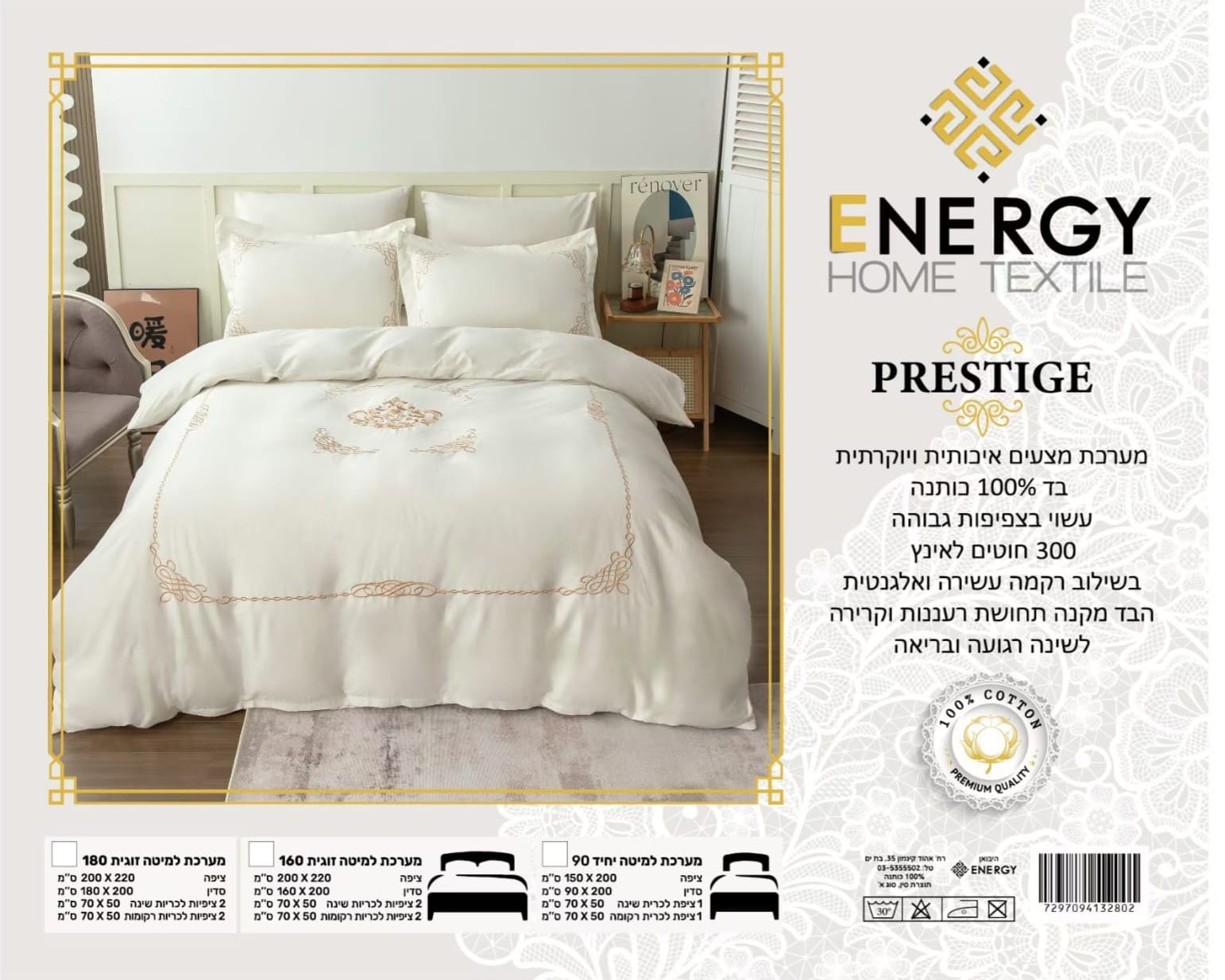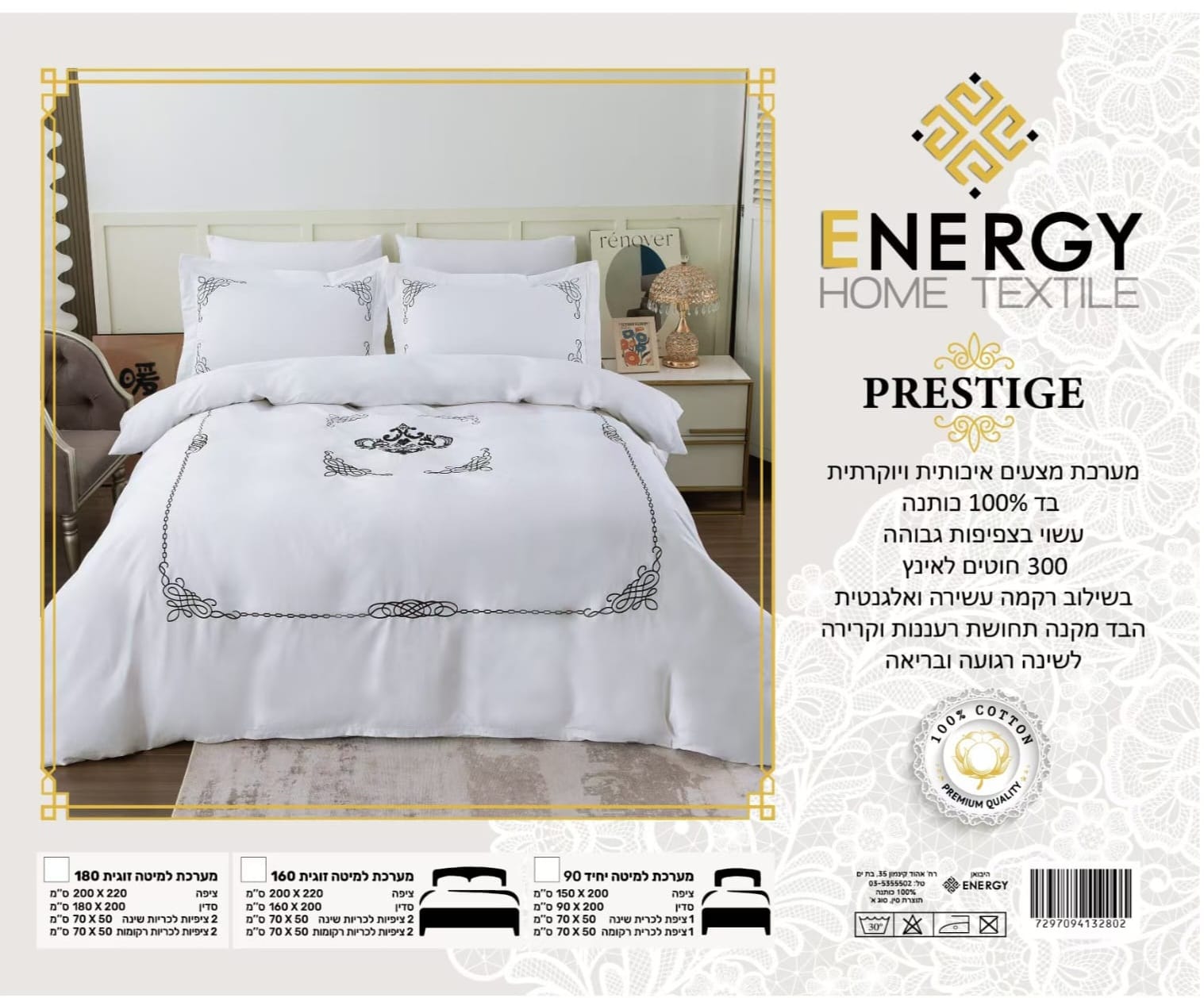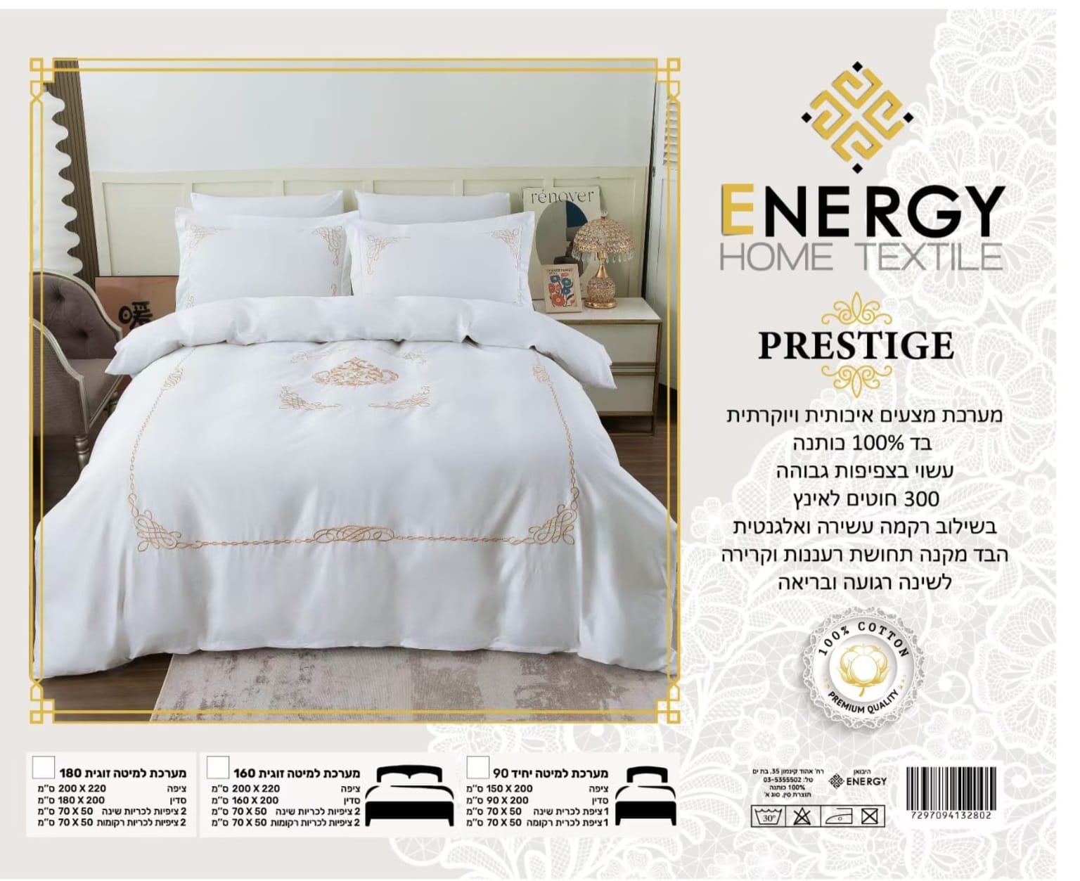 סט מצעים יוקרתי מסדרת Prestige מבית Energy Home Textile, בעיצוב קלאסי ואלגנטי המשלב רקמה עדינה ומוקפדת ליצירת מראה עשיר ויוקרתי בחדר השינה. הסט מעניק תחושת מלון ברמה גבוהה ומתאים הן לשימוש יומיומי והן לאירוח יוקרתי.