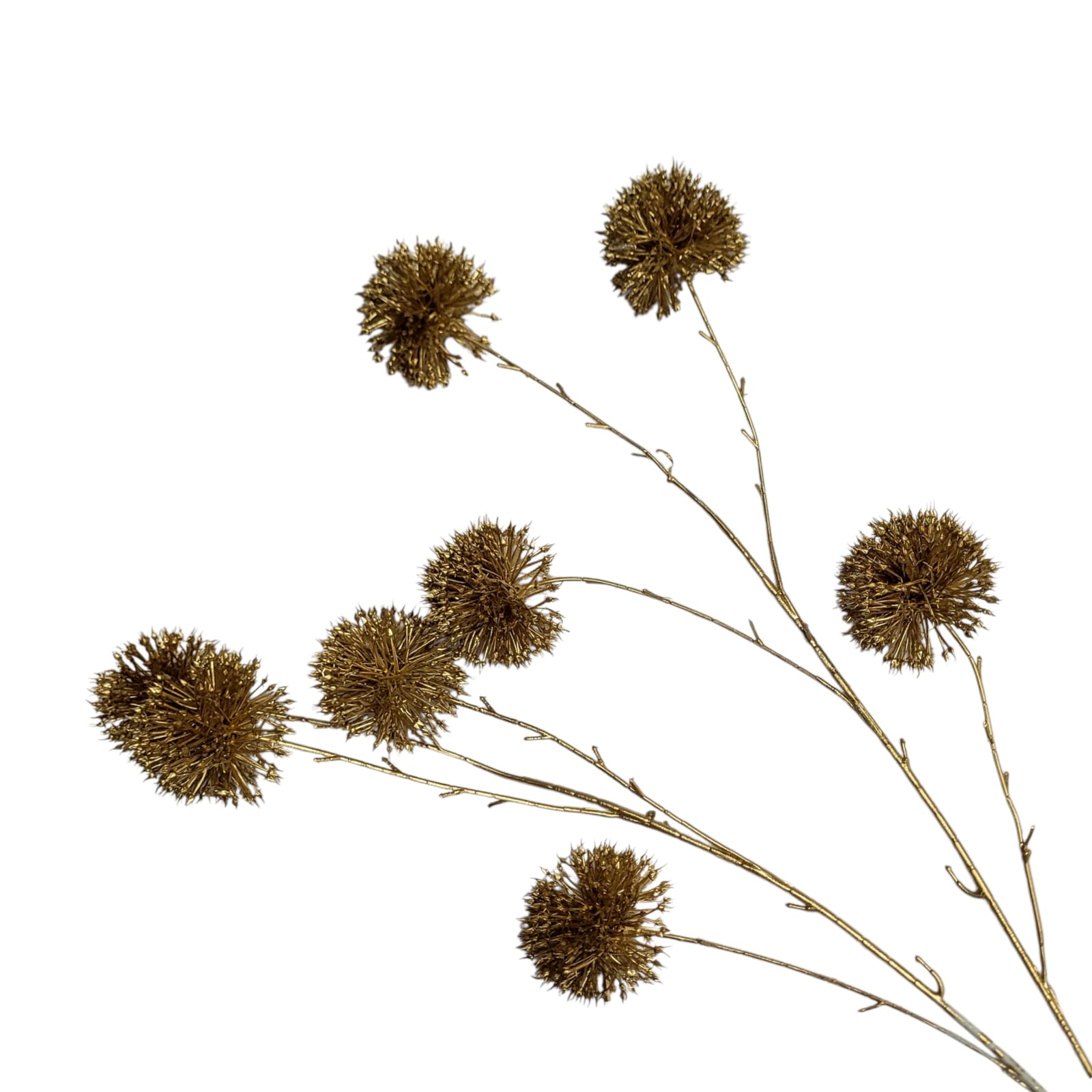 סידור פרחים מלאכותיים דקורטיבי בסגנון קוצים עגולים, המזכירים כדורי דרדר מיובש. הגבעולים והפרחים בצבע זהב מטאלי נוצץ, מה שמעניק מראה אלגנטי וחגיגי במיוחד. הסידור מתאים לשילוב באגרטלים, כמרכז שולחן, לקישוט הבית ולשדרוג כל חלל, וגם כפריט מושלם לעיצוב אירועים יוקרתיים.