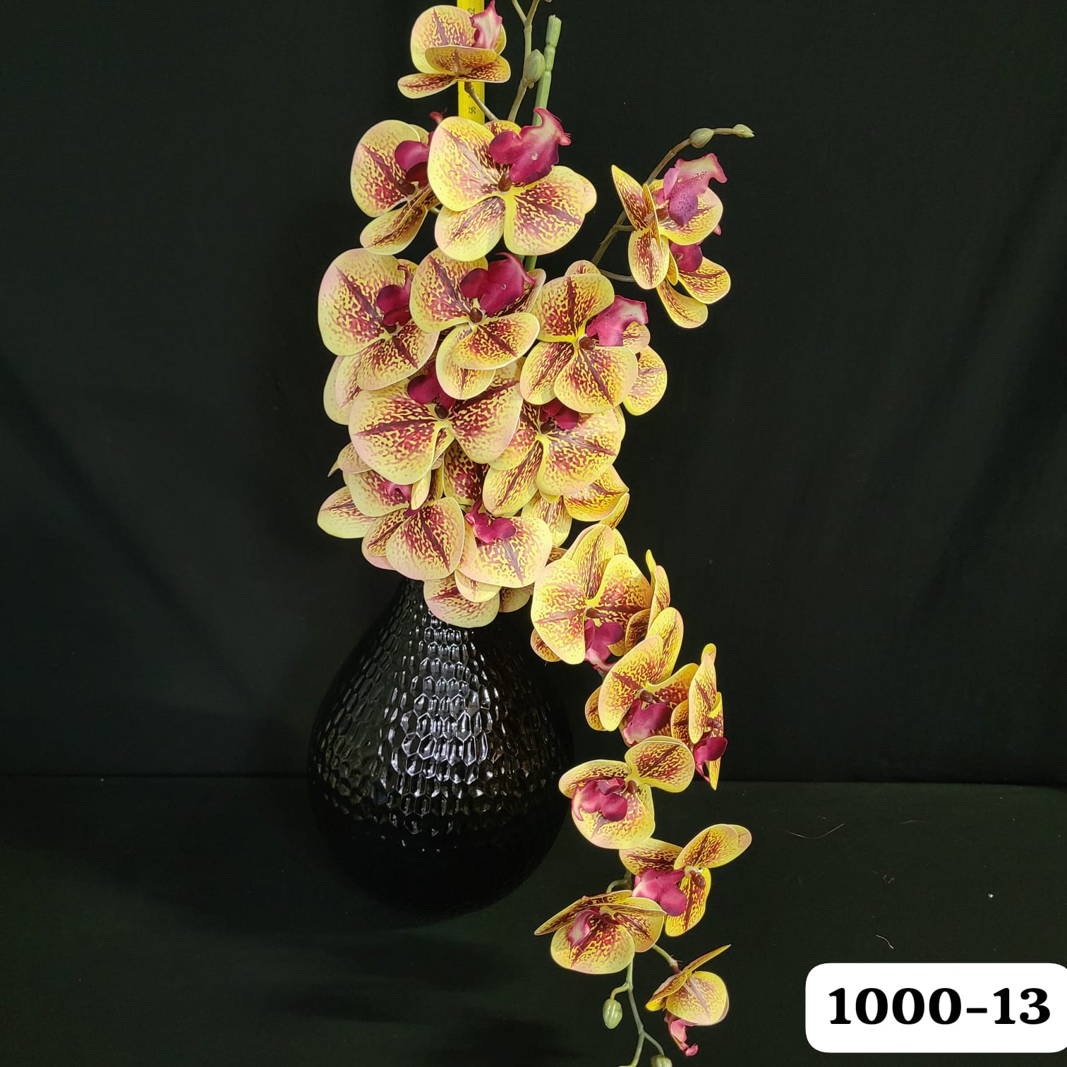פרח מלאכותי מדמה סחלב (אורכידאה) מסוג פלנופסיס בעל מראה מרהיב ואקזוטי. עלי הכותרת בגוון צהוב עם טקסטורה מנוקדת בצבע בורדו עמוק, מרכז הפרח סגול-בורדו עשיר. העיצוב מדמה סחלב נופל ומרשים, אידאלי לסידורים אנכיים באגרטלים גבוהים, להוספת מראה יוקרתי לעיצוב הבית או לאירועים.