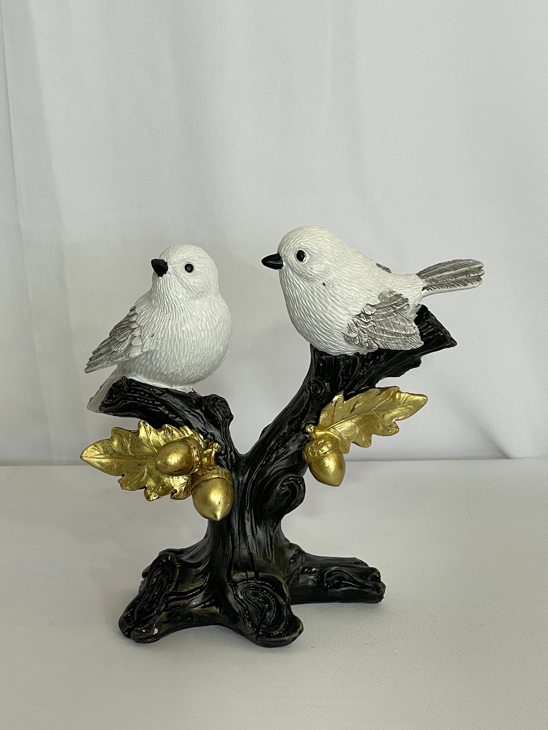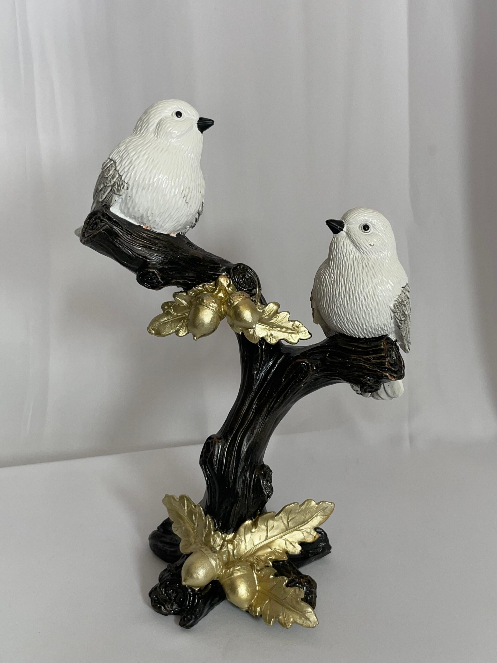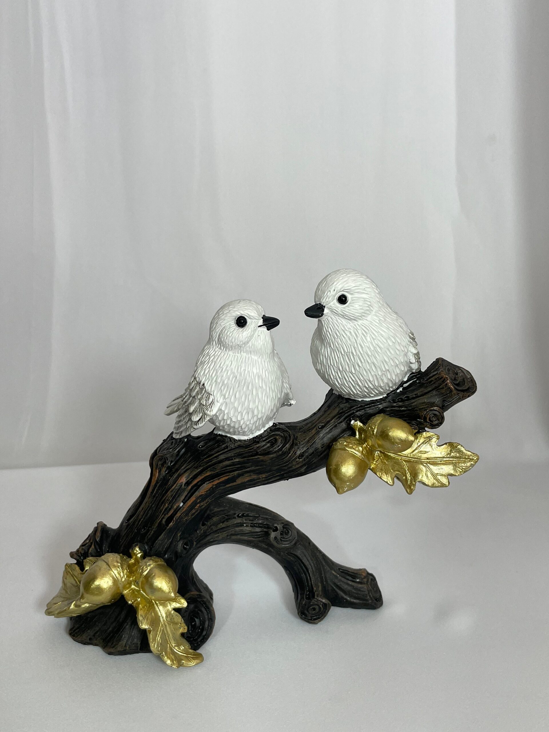פסלי ציפורים דקורטיביים בעיצוב אומנותי ייחודי, המציגים זוג ציפורים לבנות יושבות על ענף כהה בעל פרטים טבעיים. הענף מעוטר בעלים ובלוטים בגוון זהב מטאלי, המוסיפים מראה יוקרתי ואלגנטי. שילוב הצבעים – לבן, שחור וזהב – יוצר תחושת איזון בין טבע לאצילות, ומתאים כקישוט שולחני, למדף ספרים, לסלון או כמתנה יוקרתית ומיוחדת.