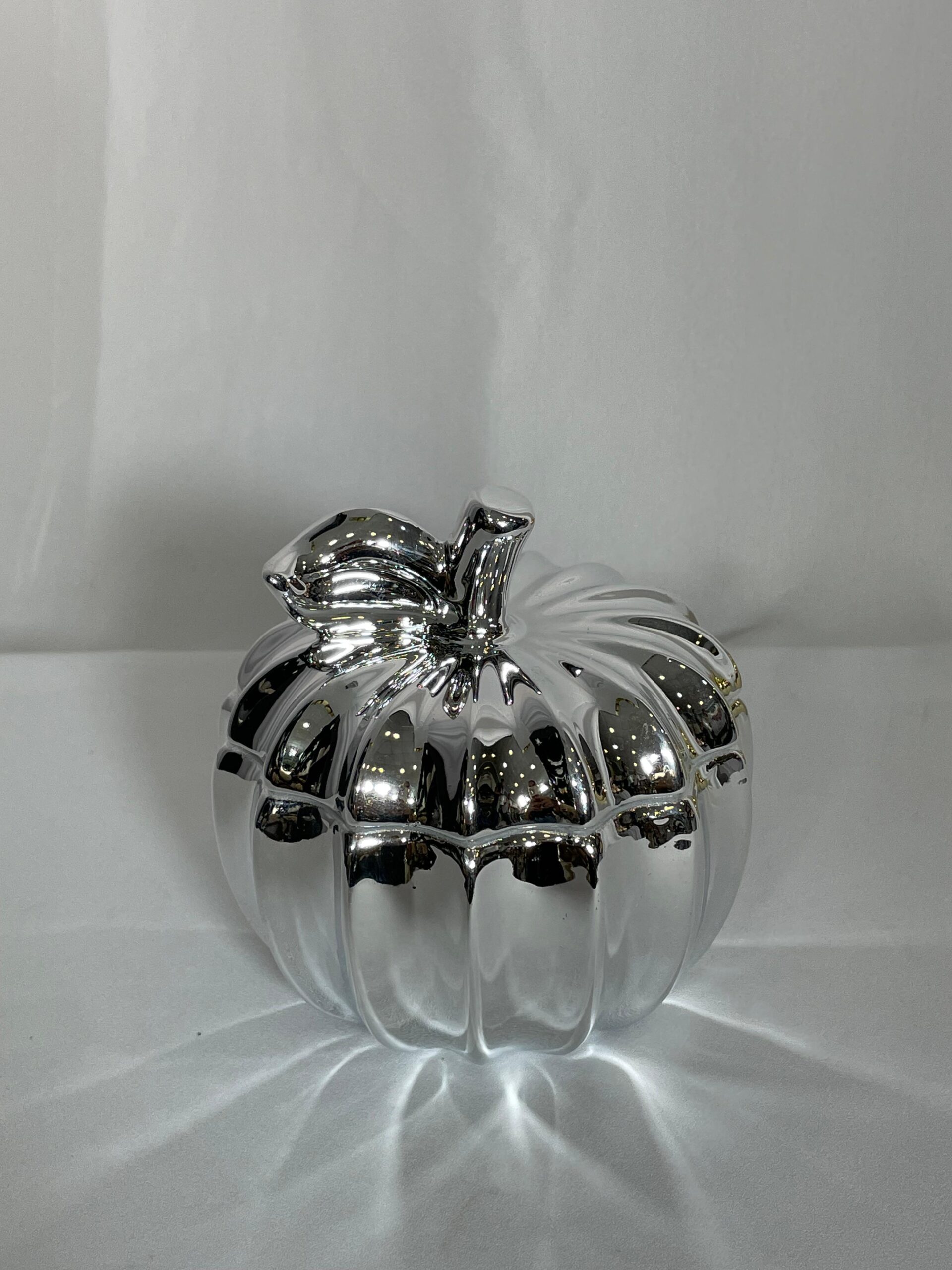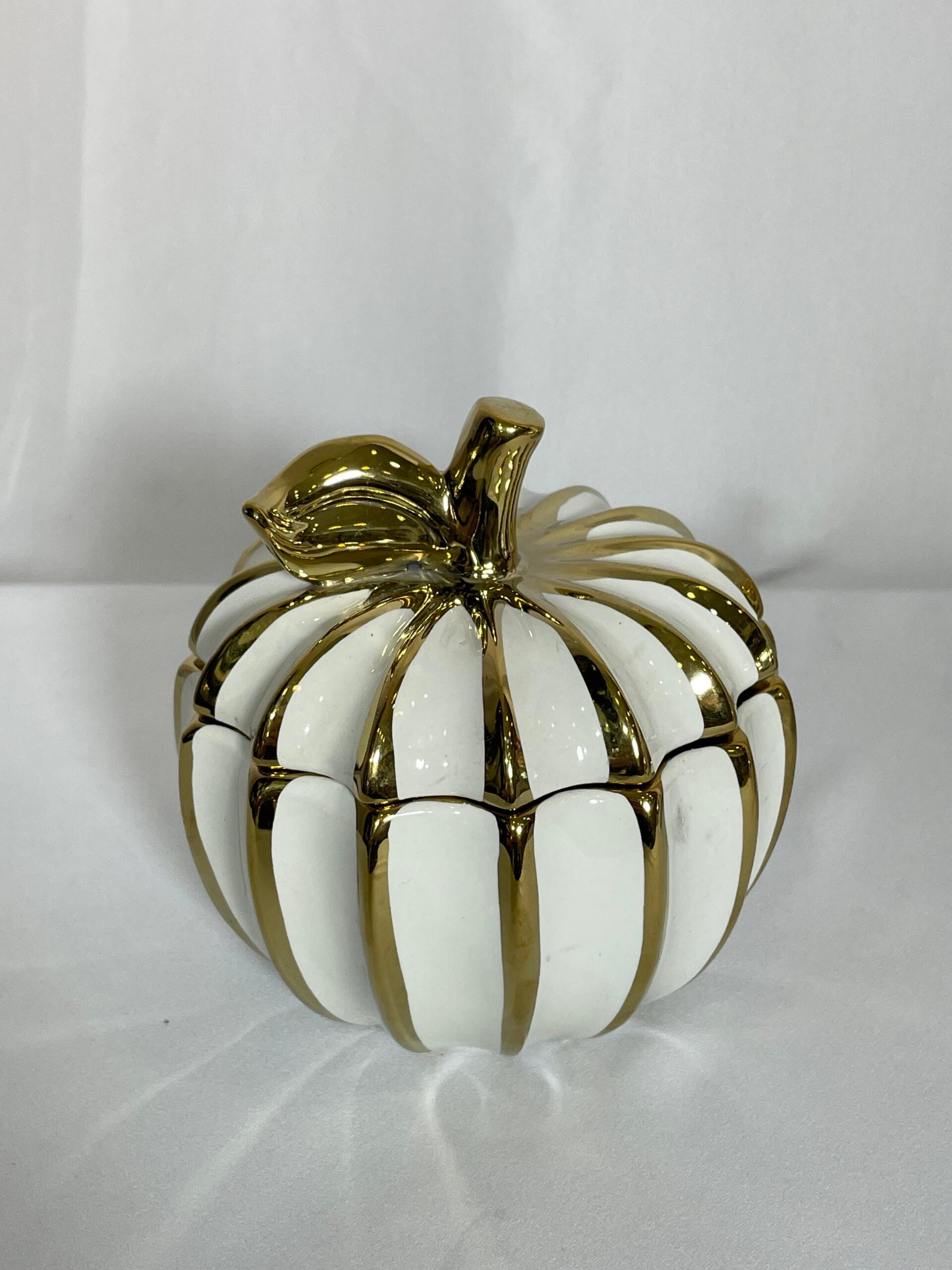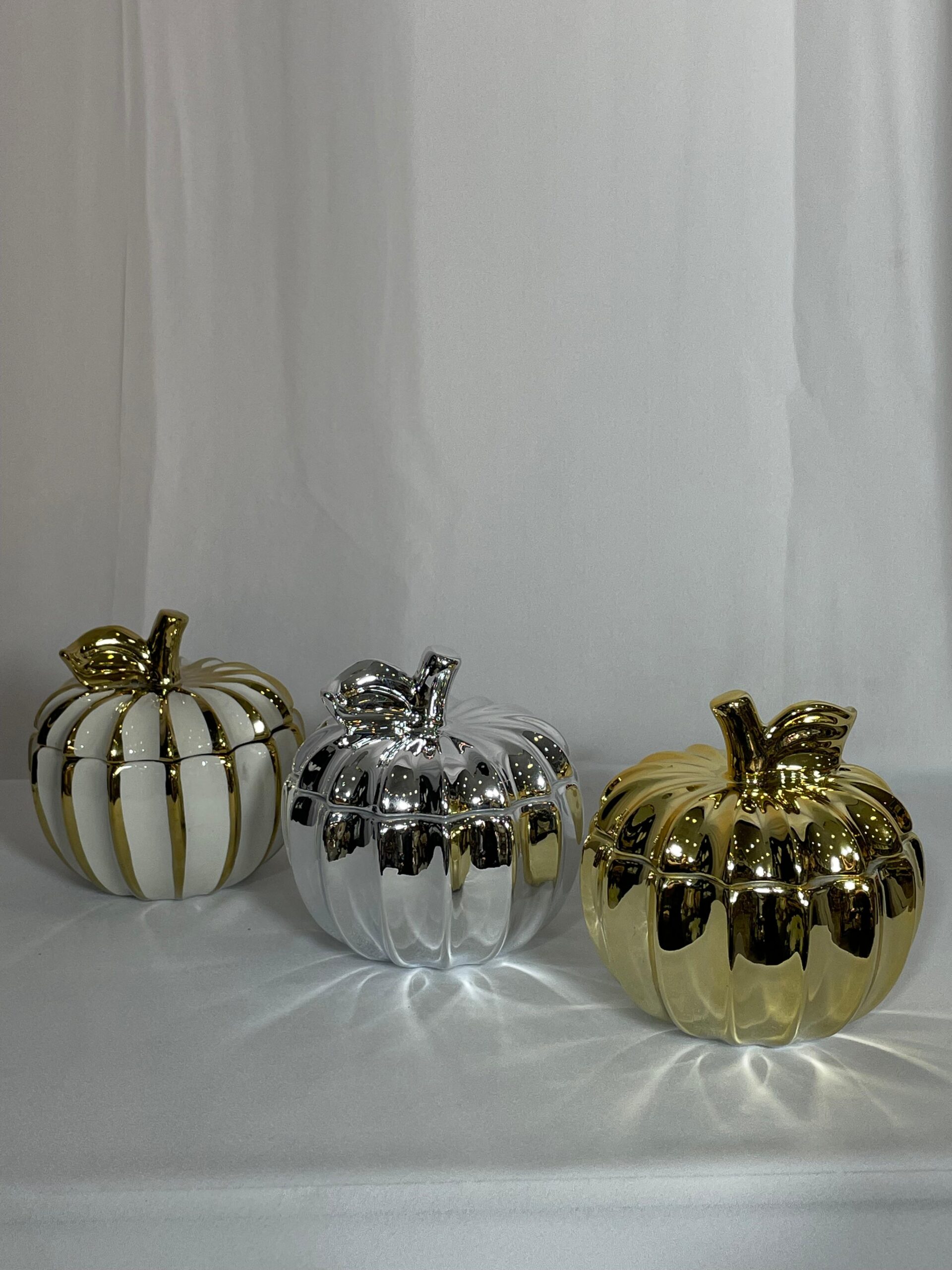 שלישיית דלועים דקורטיביים מקרמיקה בעיצוב יוקרתי ונוצץ. כל דלעת מעוצבת בצורה עגלגלה עם מכסה עליון בצורת גבעול ועלים, ומתאימה לאחסון קטן או כפריט נוי לבית. הסט כולל שלושה צבעים מרהיבים לבחירה: דלעת בצבע לבן עם פסים מוזהבים למראה קלאסי ואלגנטי, דלעת בצבע כסף מבריק המשדר מודרניות ויוקרה, ודלעת מוזהבת מלאה בעלת ברק מרשים שמוסיפה תחושת פאר ועושר. המוצרים מתאימים לעיצוב הבית, לעיצוב שולחן חגיגי וגם לעיצוב אירועים יוקרתיים, ומוסיפים טאצ' אלגנטי לכל חלל או חגיגה.