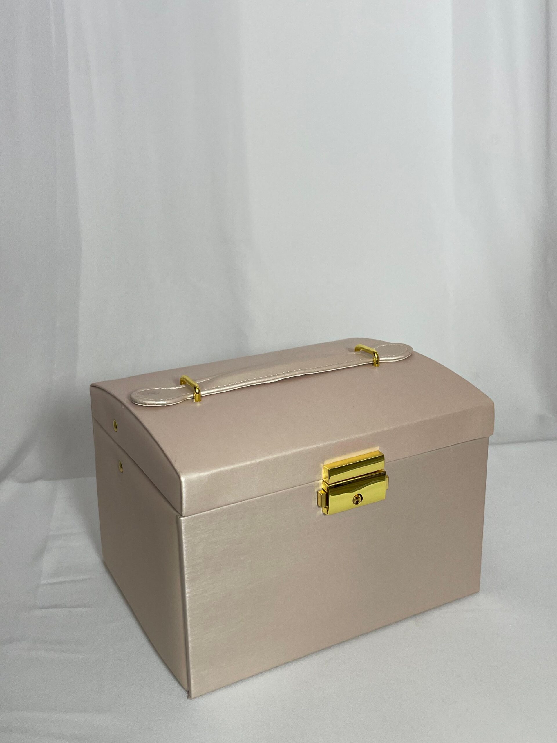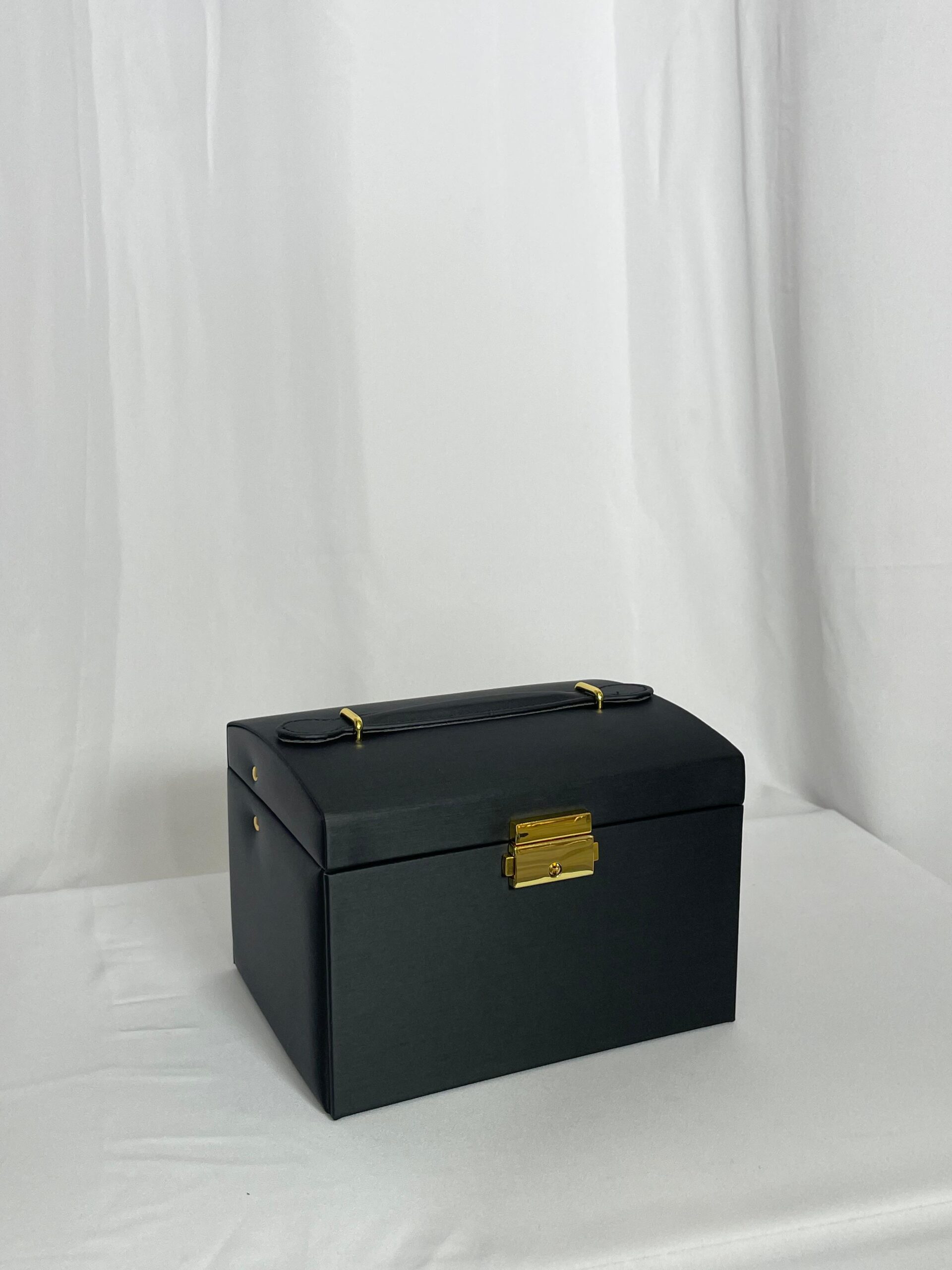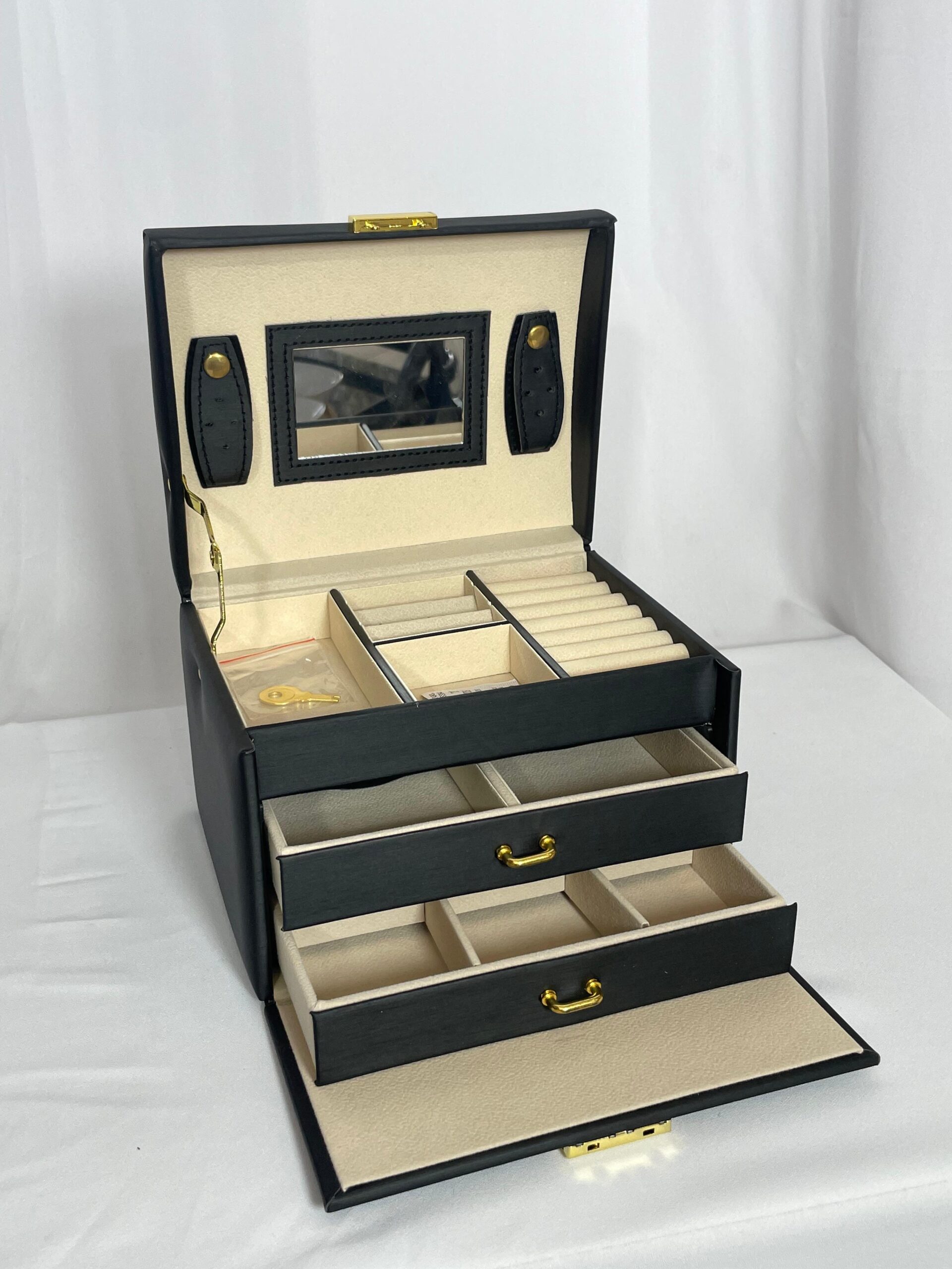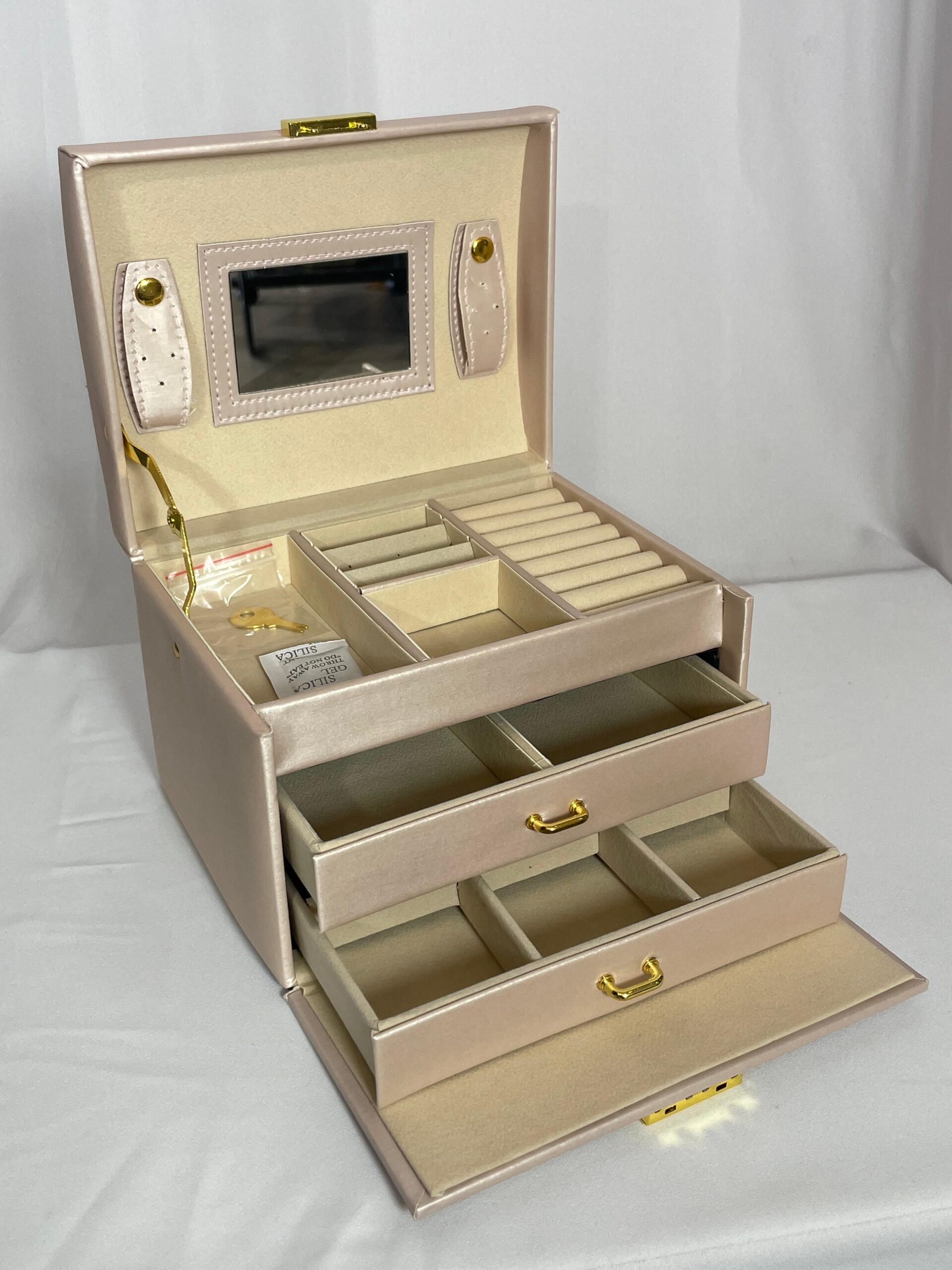 קופסת תכשיטים יוקרתית עם מראה פנימית ותאים מרובים לארגון טבעות, עגילים, צמידים ושעונים. מגיעה עם שני מגירות רחבות וחלוקה פנימית נוחה לשמירה על סדר והגנה על התכשיטים. עשויה חומרים איכותיים עם גימור אלגנטי ונעילה קדמית.