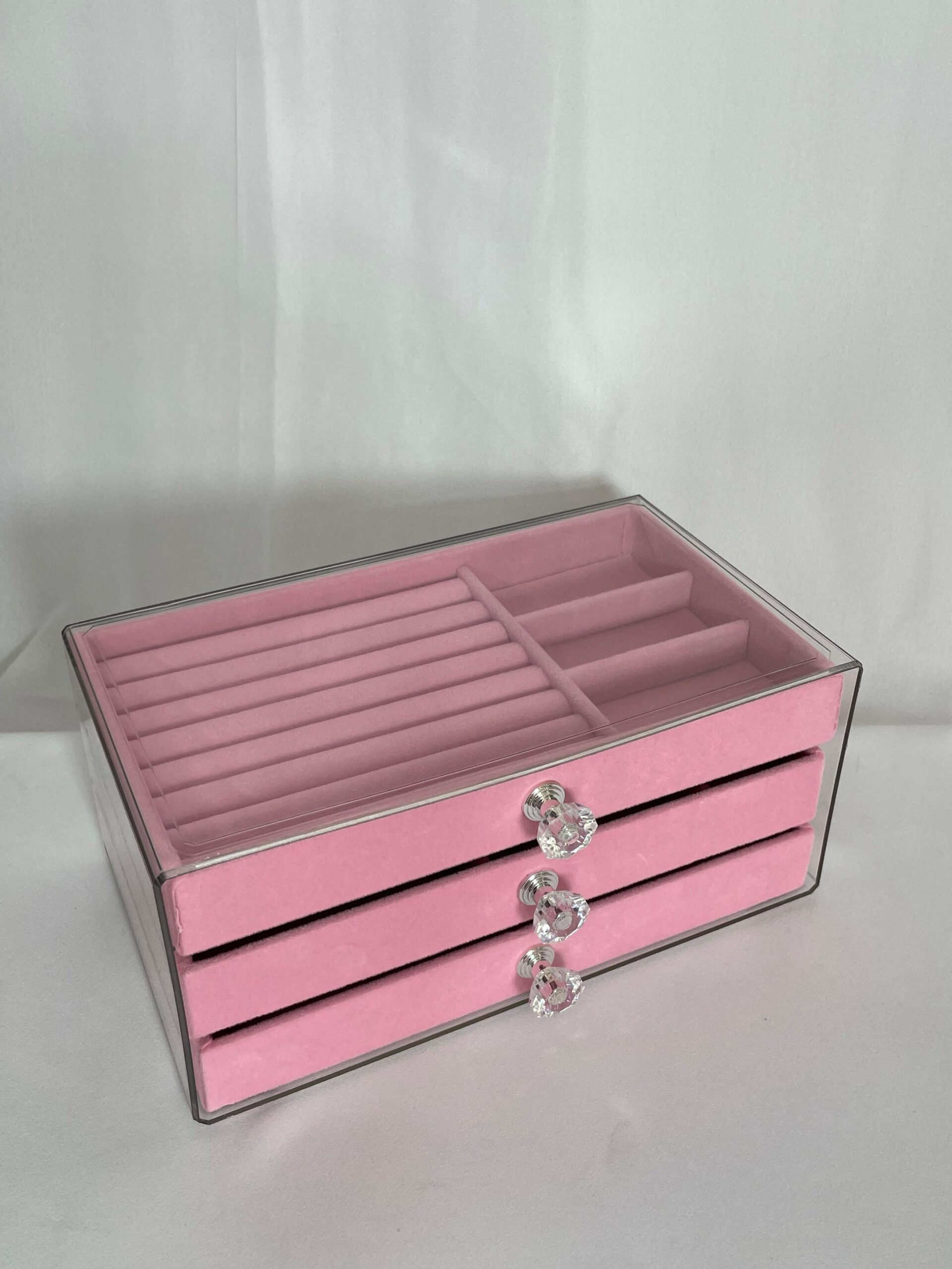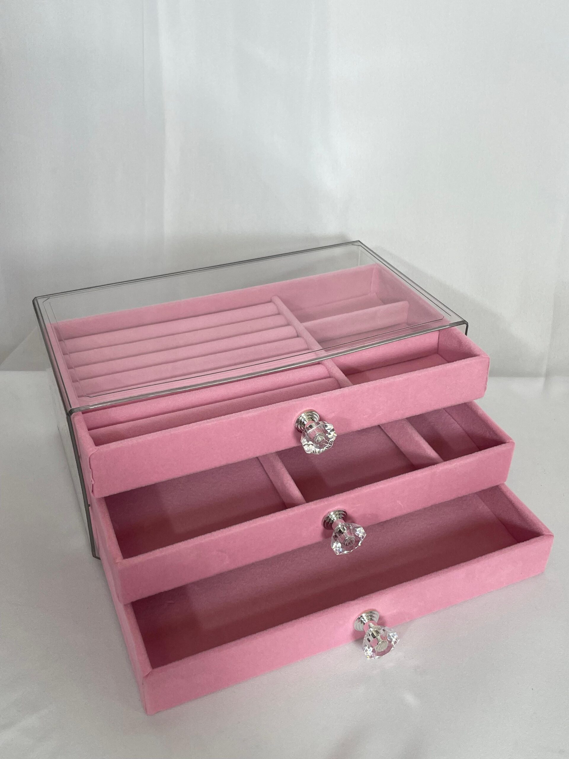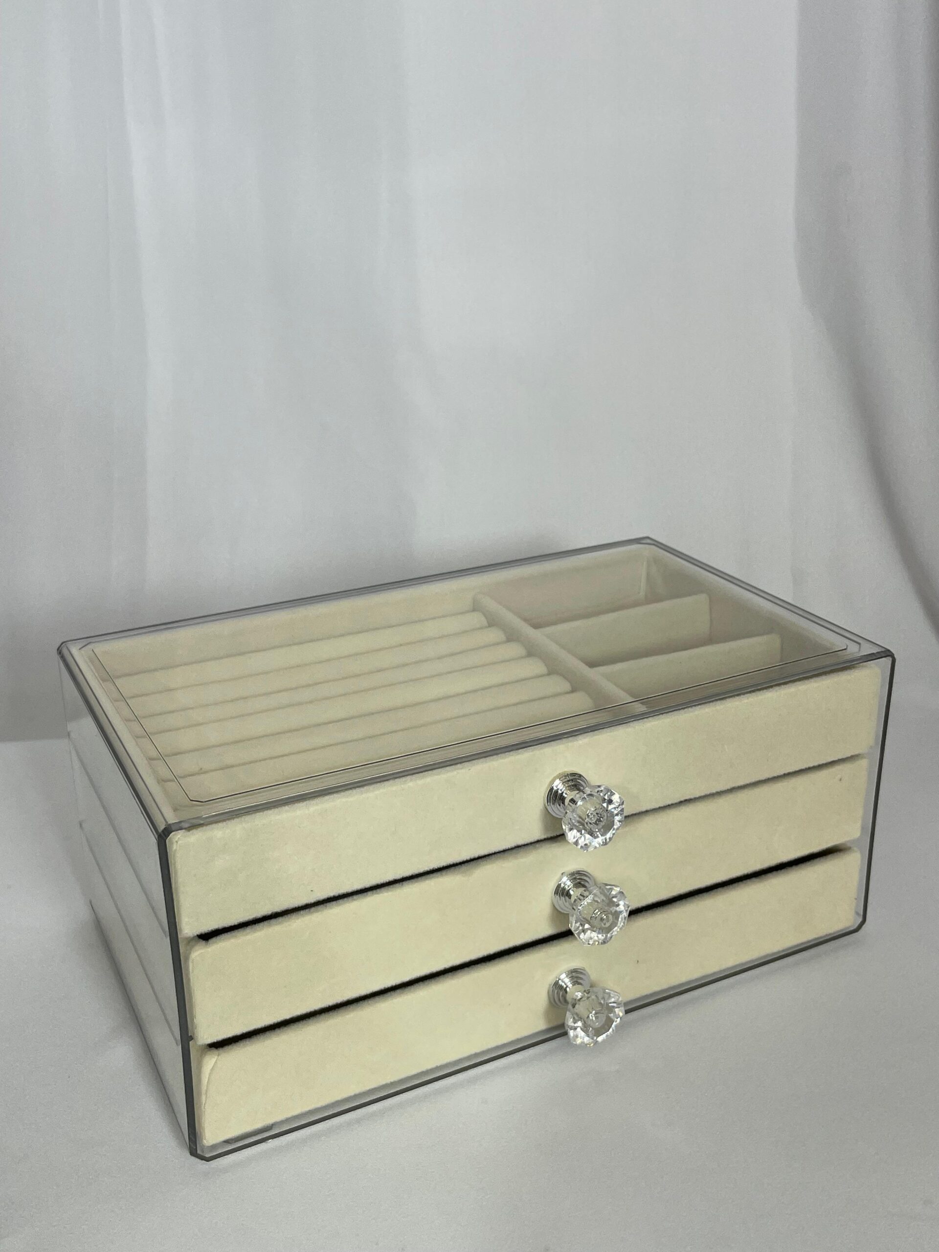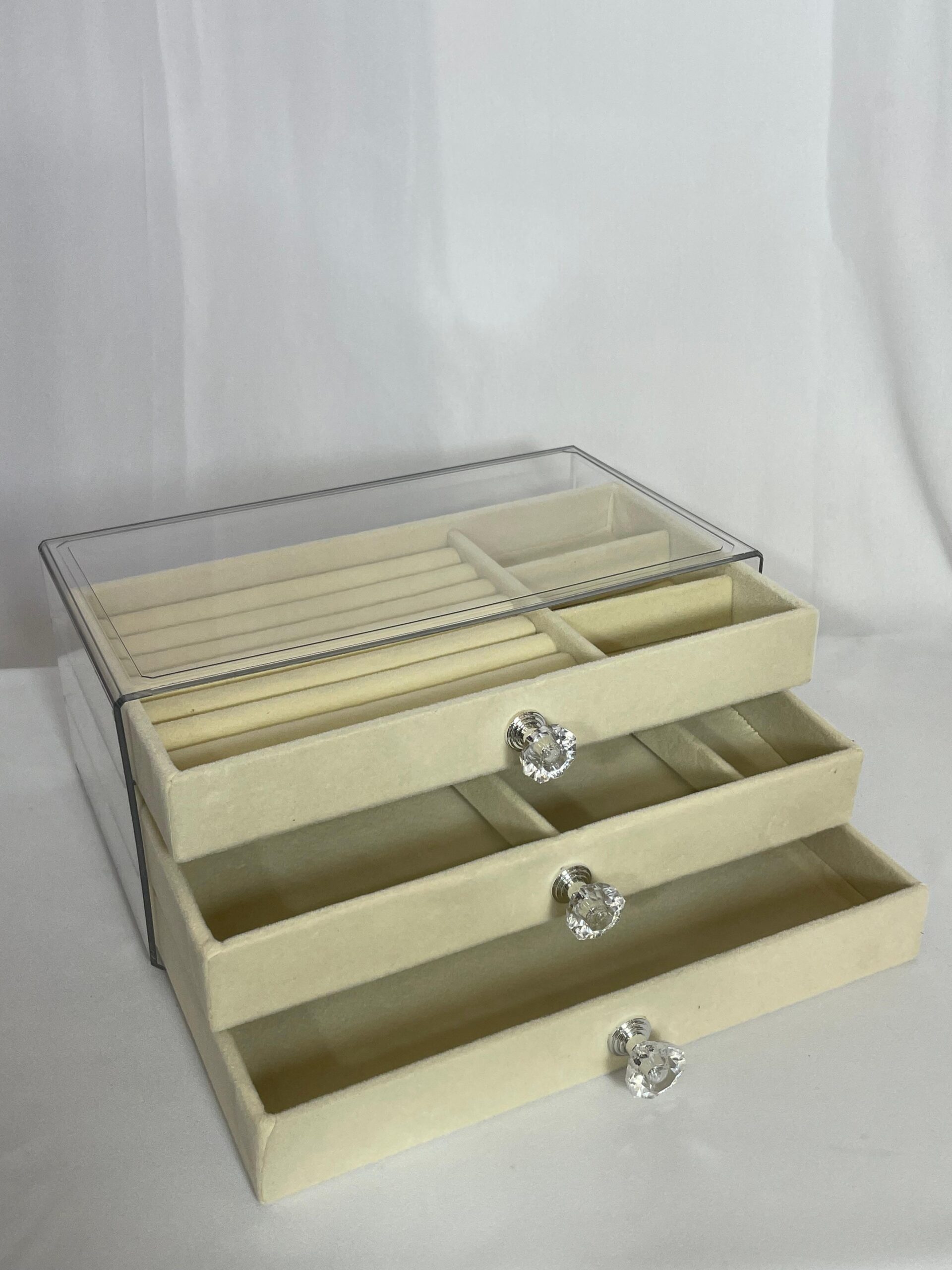 קופסת תכשיטים אלגנטית בעלת שלוש קומות, עם חלוקה פנימית נוחה לטבעות, שרשראות, עגילים וצמידים. מגיעה עם מכסה שקוף לנראות קלה ומהירה, ידיות קריסטל מעוצבות לכל מגירה וגימור קטיפתי יוקרתי. פתרון מושלם לשמירה על סדר וסטייל.
