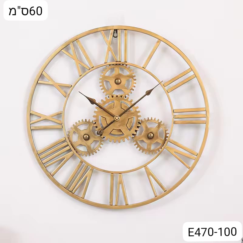 שעון קיר מתכת עגול בקוטר 60 ס"מ בעיצוב יוקרתי בסגנון סטימפאנק. עיצוב ייחודי עם גלגלי שיניים דקורטיביים במרכז המוסיפים אופי תעשייתי מודרני. מסגרת מתכת בצבע זהב עם ספרות רומיות גדולות וברורות לעיצוב קלאסי-מודרני.
